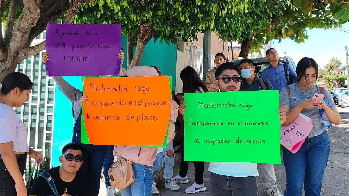 Un grupo de docentes de diferentes escuelas, entre ellas Mactumactzá y la Universidad Pedagógica Nacional (UPN), se reunieron frente a la Secretaría de Educación en Chiapas para exigir la liberación de plazas. Esto afecta a más de 3,000 maestros, de los cuales solo 140 han visto liberadas sus plazas hasta el momento.