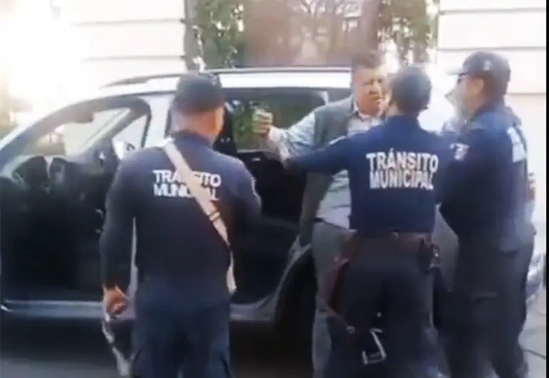 En una videograbación difundida en redes sociales, se observa cómo tres agentes de Tránsito Municipal se le acercan, lo exhortan y ayudan a subir al asiento trasero de una camioneta color gris, sin que opusiera resistencia.