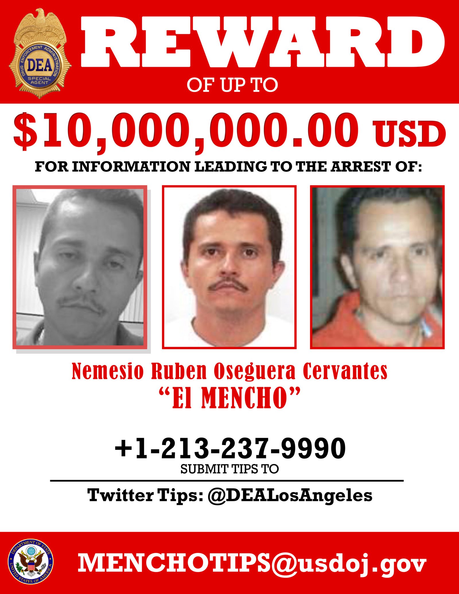 El gobierno estadounidense mantenía vigente una recompensa de hasta 15 millones de dólares por información que condujera a su captura. De acuerdo con el Departamento de Estado de Estados Unidos y el Departamento de Justicia de Estados Unidos, Oseguera Cervantes enfrentaba cargos por conspiración para el tráfico de metanfetamina, cocaína y fentanilo hacia territorio estadounidense, además del uso de armas de fuego en delitos relacionados con el narcotráfico.